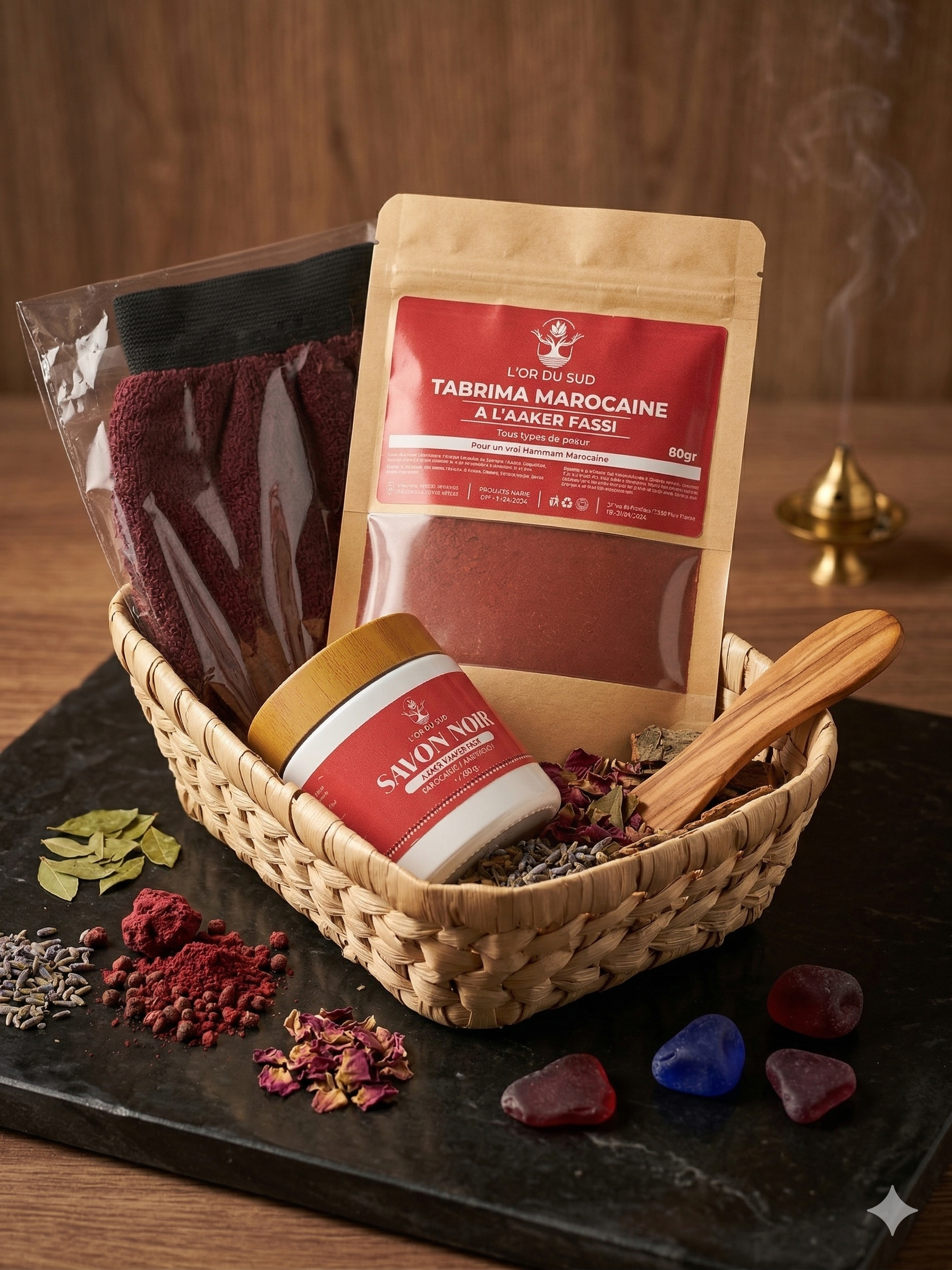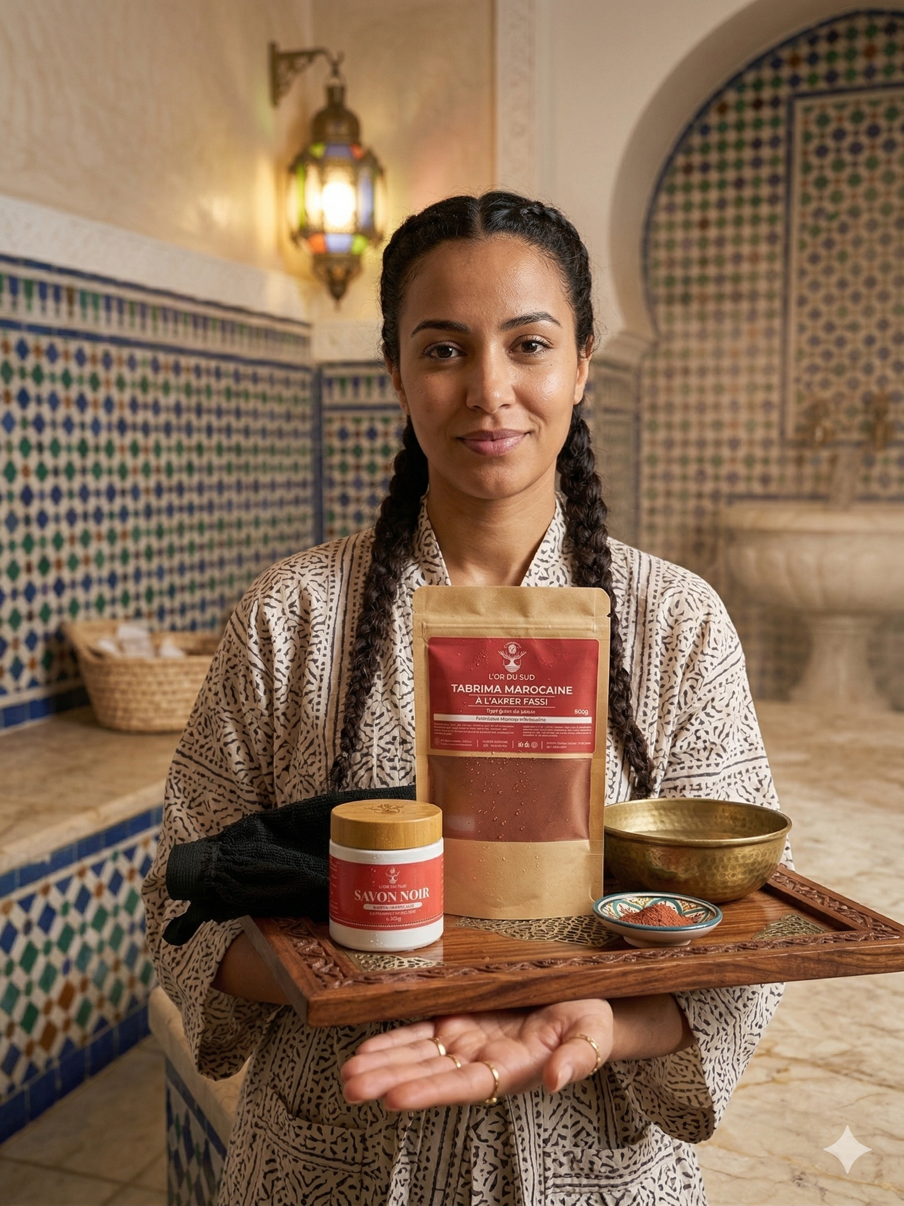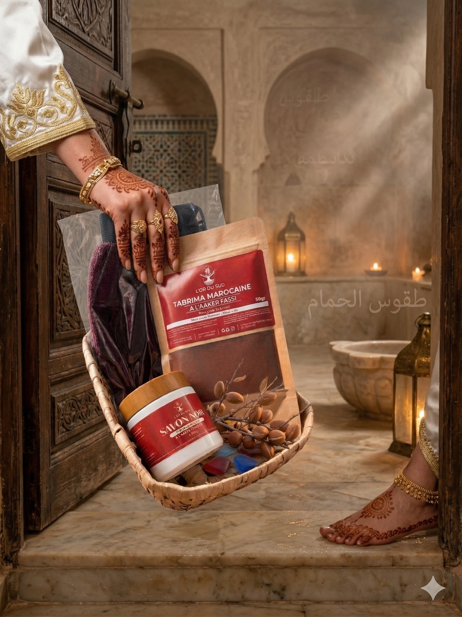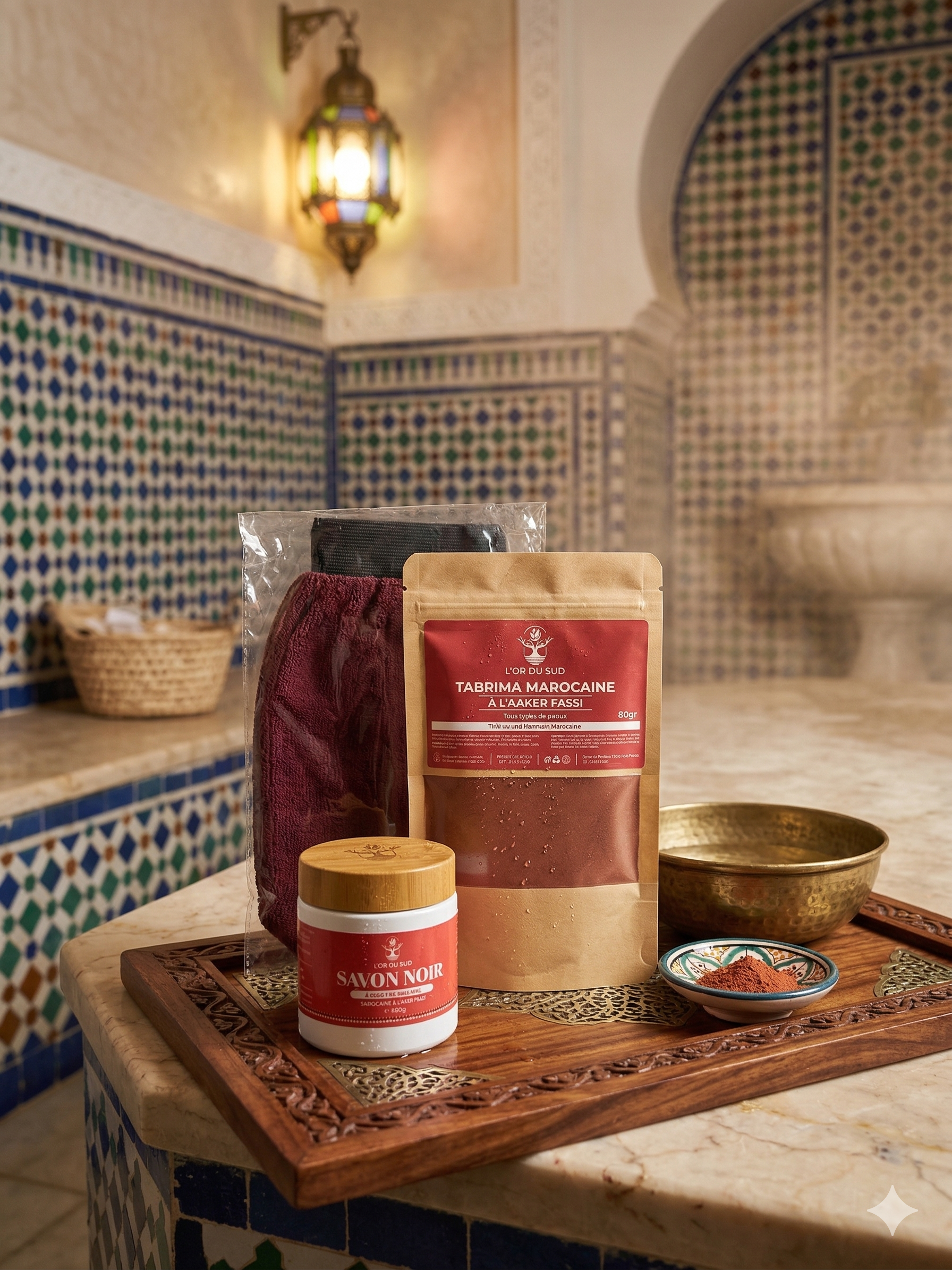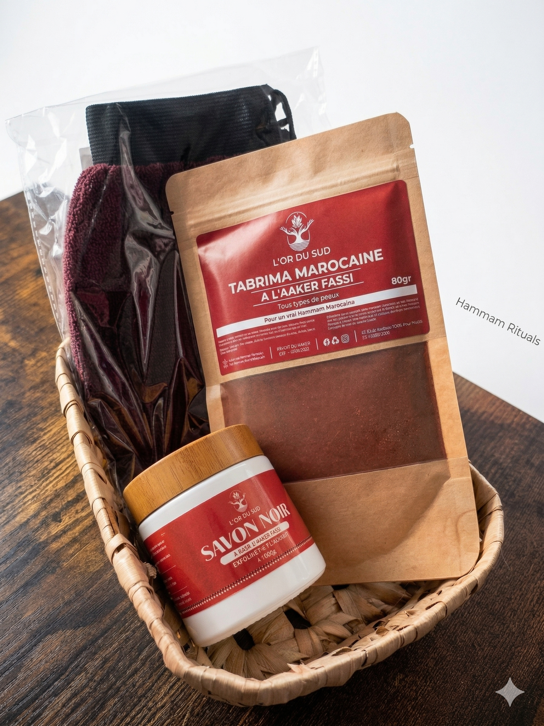 Redécouvrez la douceur d’un soin spa oriental.Pack Hammam L’Or du Sud. Ce rituel complet combine les vertus purifiantes du savon noir, la puissance éclaircissante de la tabrima marocaine et l’efficacité du gant exfoliant.